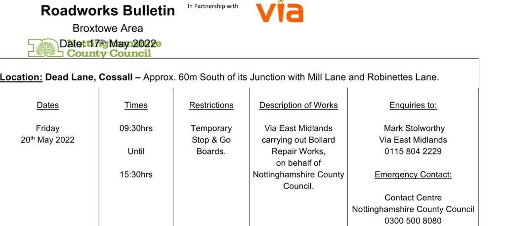 Roadworks Bulletin – Temporary Traffic Signals – Dead Lane, Cossall 17May 2022Add a comment Roadworks Bulletin – Temporary Traffic Signals – Dead Lane, Cossall Share this:Tweet Click to share on WhatsApp (Opens in new window) WhatsApp Click to email a link to a friend (Opens in new window) Email Like Loading... Related