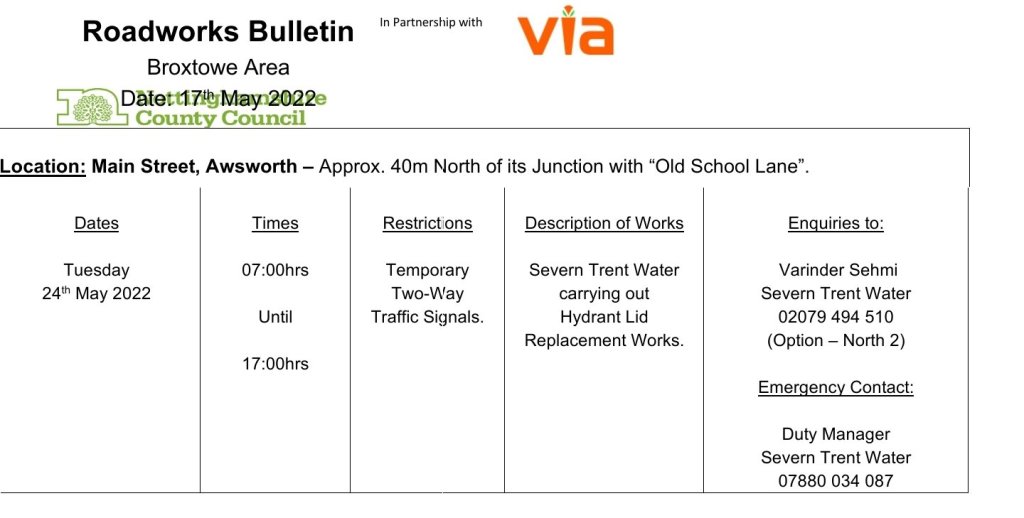 Roadworks Bulletin – Temporary Traffic Signals – Main Street, Awsworth 17May 2022Add a comment Roadworks Bulletin – Temporary Traffic Signals – Main Street, Awsworth Share this:Tweet Click to share on WhatsApp (Opens in new window) WhatsApp Click to email a link to a friend (Opens in new window) Email Like Loading... Related