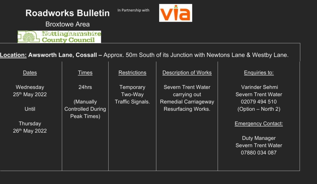 Roadworks Bulletin – Temporary Traffic Signals – Awsworth Lane, Cossall 18May 2022Add a comment Roadworks Bulletin – Temporary Traffic Signals – Awsworth Lane, Cossall Share this:Tweet Click to share on WhatsApp (Opens in new window) WhatsApp Click to email a link to a friend (Opens in new window) Email Like Loading... Related