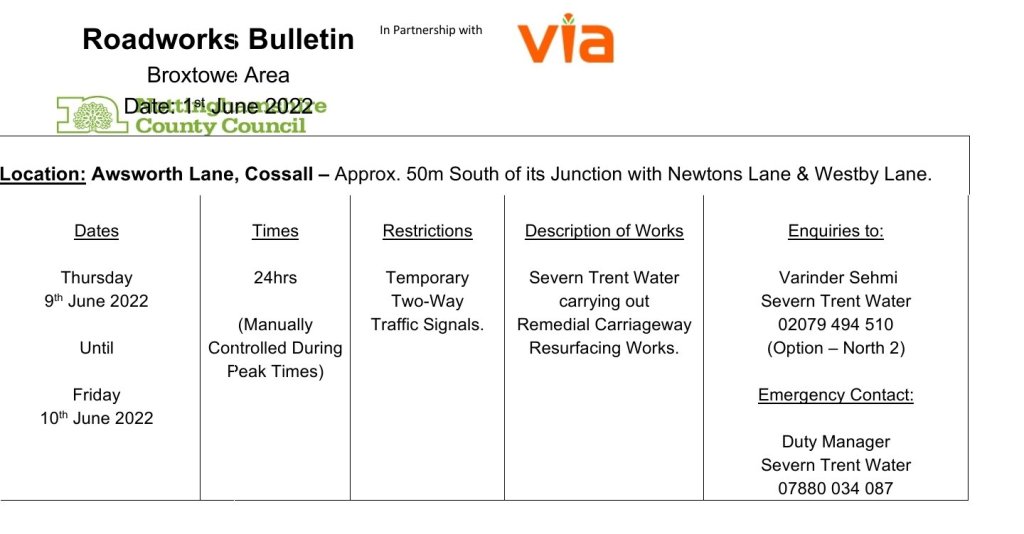 Roadworks Bulletin – Temporary Traffic Signals – Awsworth Lane, Cossall 1Jun 2022Add a comment Roadworks Bulletin – Temporary Traffic Signals – Awsworth Lane, Cossall Share this:Tweet Click to share on WhatsApp (Opens in new window) WhatsApp Click to email a link to a friend (Opens in new window) Email Like Loading... Related