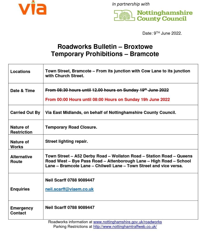 Roadworks Bulletin – Temporary Road Closure – Town Street, Bramcote