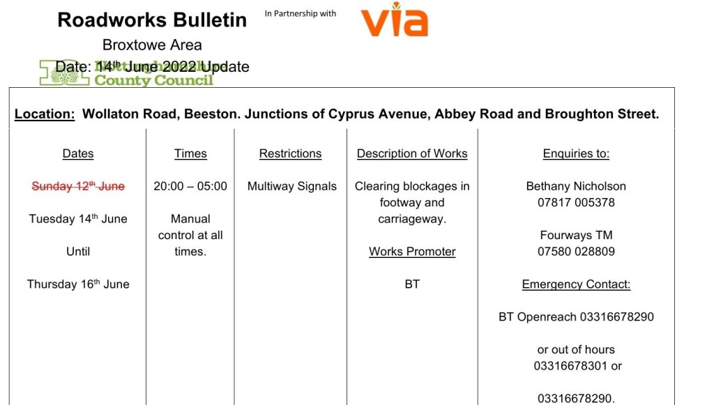 Please find attached the Updated Roadworks Bulletin for Temporary Traffic Signals at Wollaton Road, Beeston. Junctions of Cyprus Avenue, Abbey Road and Broughton Street.