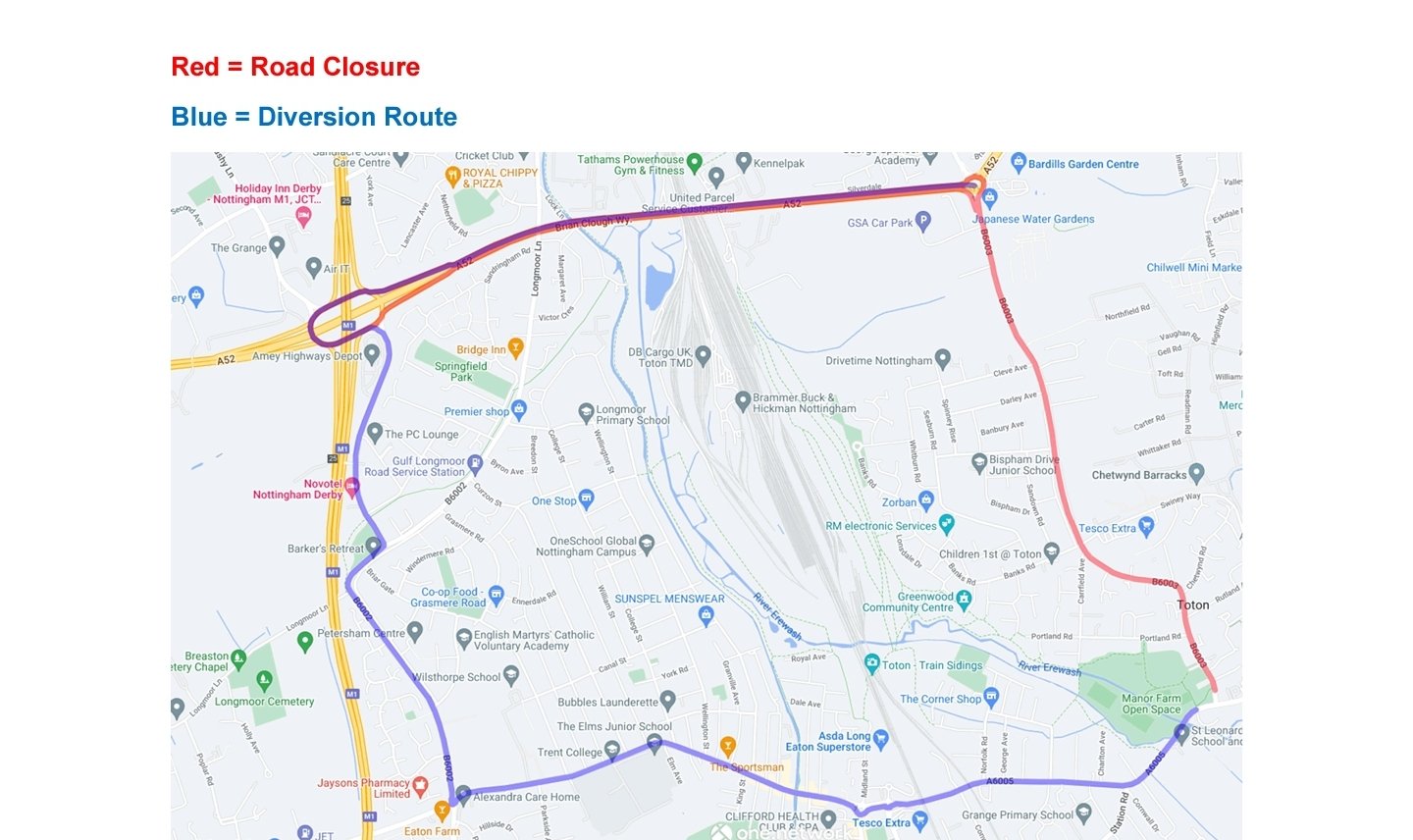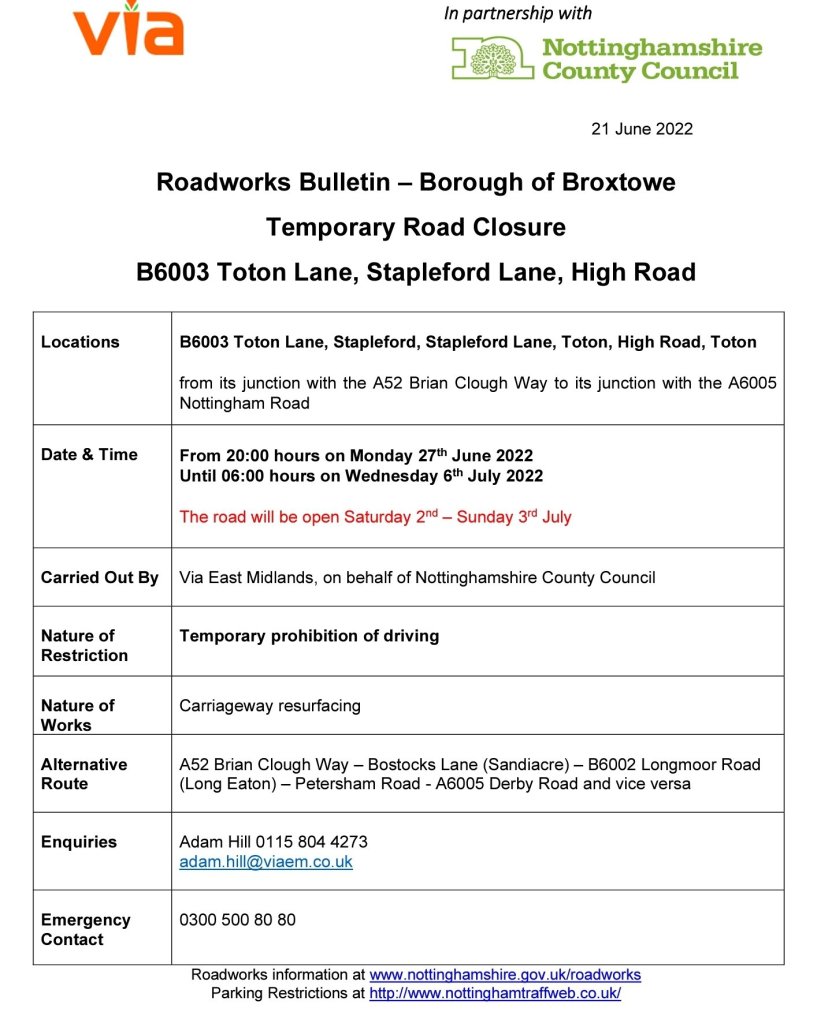 Roadworks Bulletin – Temporary Road Closure – B6003 Stapleford Lane, Toton Lane, High Road (27/6-1/7 & 4-6/7) 21Jun 2022Add a comment Roadworks Bulletin – Temporary Road Closure – B6003 Stapleford Lane, Toton Lane, High Road (27/6-1/7 & 4-6/7) Share this:Tweet Click to share on WhatsApp (Opens in new window) WhatsApp Click to email a link to a friend (Opens in new window) Email Like Loading... Related