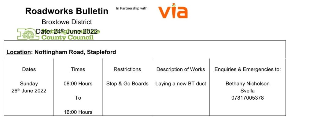Roadworks Bulletin – Temporary Traffic Signals – Nottingham Road, Stapleford 24Jun 2022Add a comment Roadworks Bulletin – Temporary Traffic Signals – Nottingham Road, Stapleford Share this:Tweet Click to share on WhatsApp (Opens in new window) WhatsApp Click to email a link to a friend (Opens in new window) Email Like Loading... Related