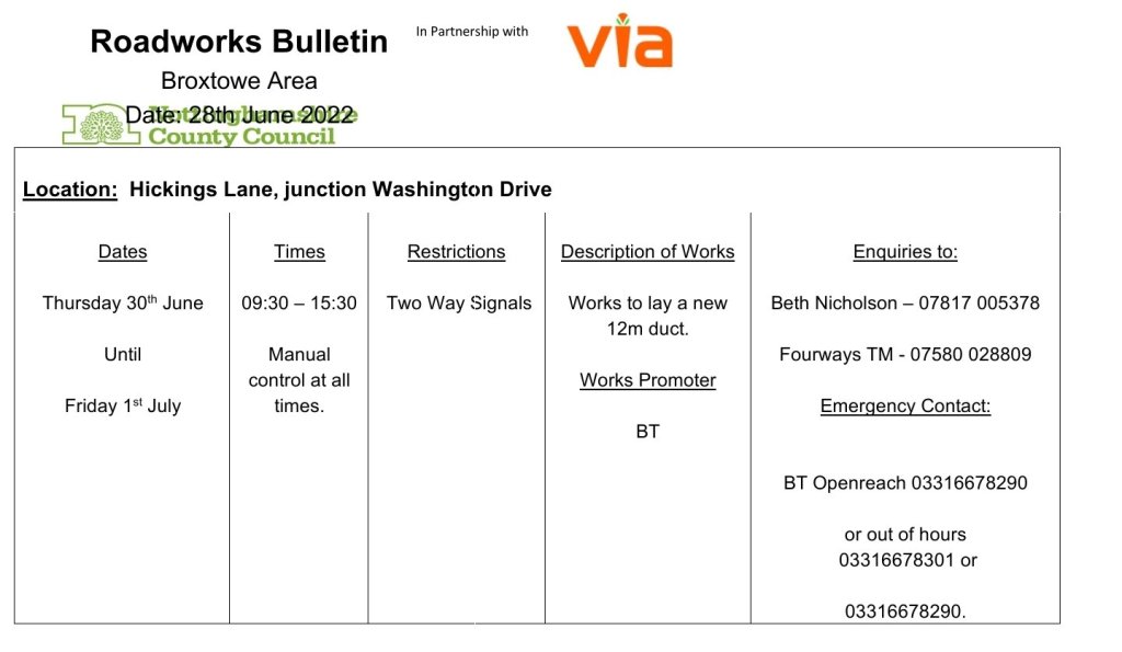 Roadworks Bulletin – Temporary Traffic Signals – Hickings Lane, Stapleford 28Jun 2022Add a comment Roadworks Bulletin – Temporary Traffic Signals – Hickings Lane, Stapleford Share this:Tweet Click to share on WhatsApp (Opens in new window) WhatsApp Click to email a link to a friend (Opens in new window) Email Like Loading... Related