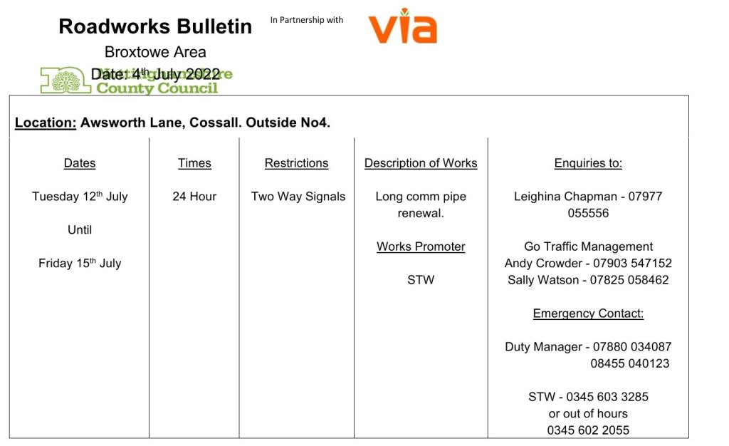 Roadworks Bulletin – Temporary Traffic Signals – Awsworth Lane, Cossall 12th July 4Jul 2022Add a comment Please find attached the Roadworks Bulletin for Temporary Traffic Signals at Awsworth Lane, Cossall. Outside No4. Share this:Tweet Click to share on WhatsApp (Opens in new window) WhatsApp Click to email a link to a friend (Opens in new window) Email Like Loading... Related