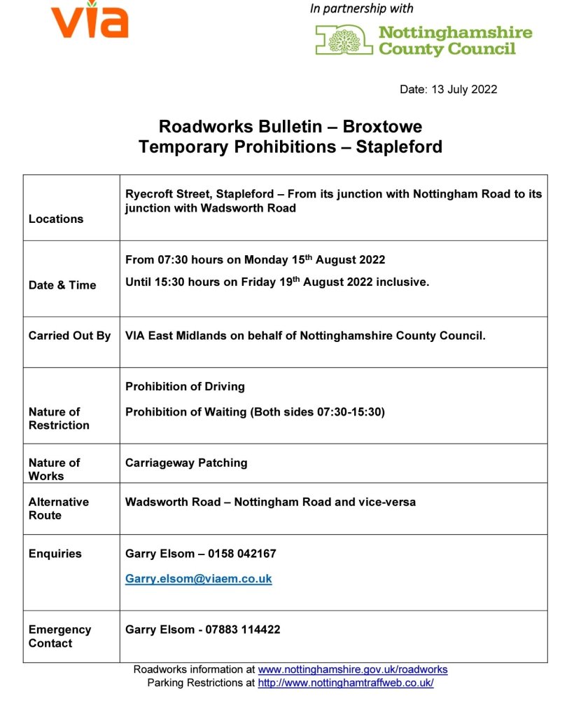 Roadworks Bulletin – Temporary Road Closure – Ryecroft Street, Stapleford 13Jul 2022Add a comment Roadworks Bulletin – Temporary Road Closure – Ryecroft Street, Stapleford Share this:Tweet Click to share on WhatsApp (Opens in new window) WhatsApp Click to email a link to a friend (Opens in new window) Email Like Loading... Related