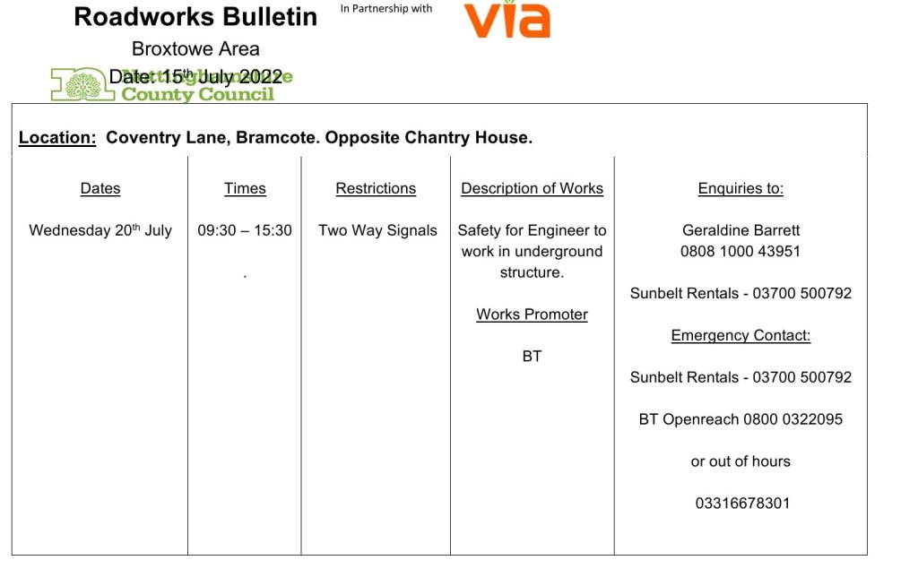 Please find attached the Roadworks Bulletin for Temporary Traffic Signals at Coventry Lane, Bramcote. Opposite Chantry House.