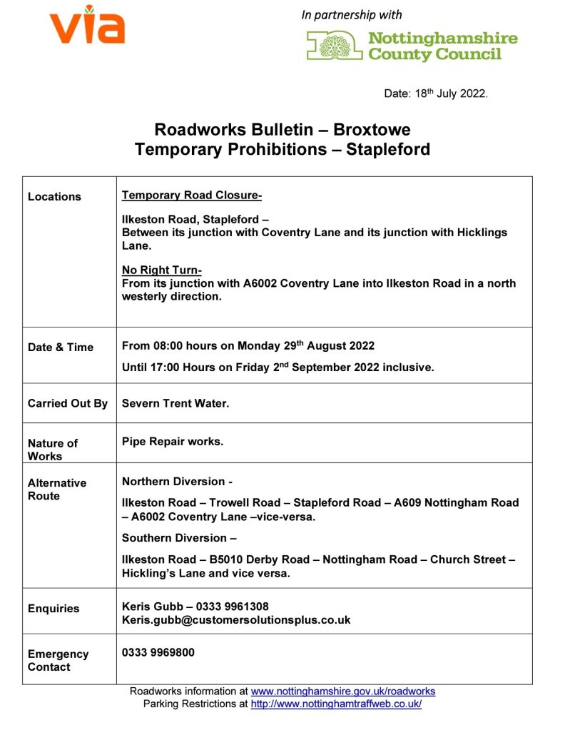 Roadworks Bulletin – Temporary Road Closure – Ilkeston Road, Stapleford 18Jul 2022Add a comment Roadworks Bulletin – Temporary Road Closure – Ilkeston Road, Stapleford Share this:Tweet Click to share on WhatsApp (Opens in new window) WhatsApp Click to email a link to a friend (Opens in new window) Email Like Loading... Related