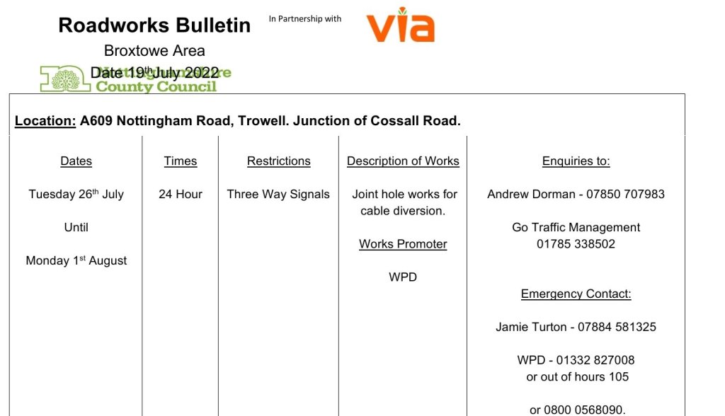 Please find attached the Roadworks Bulletin for Temporary Traffic Signals at A609 Nottingham Road, Trowell. Junction of Cossall Road.