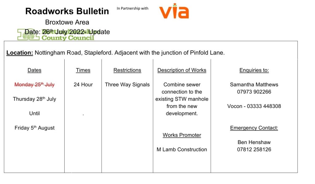 Please find attached the updated Roadworks Bulletin for Temporary Traffic Signals at Nottingham Road, Stapleford. Adjacent with the junction of Pinfold Lane.
