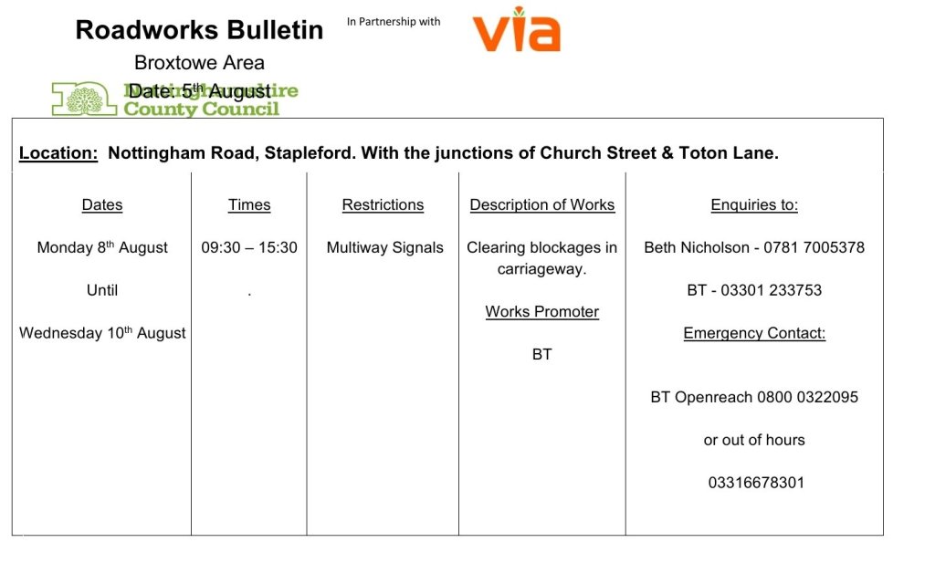 Please find attached the Roadworks Bulletin for Temporary Traffic Signals at Nottingham Road, Stapleford. With the junctions of Church Street & Toton Lane.