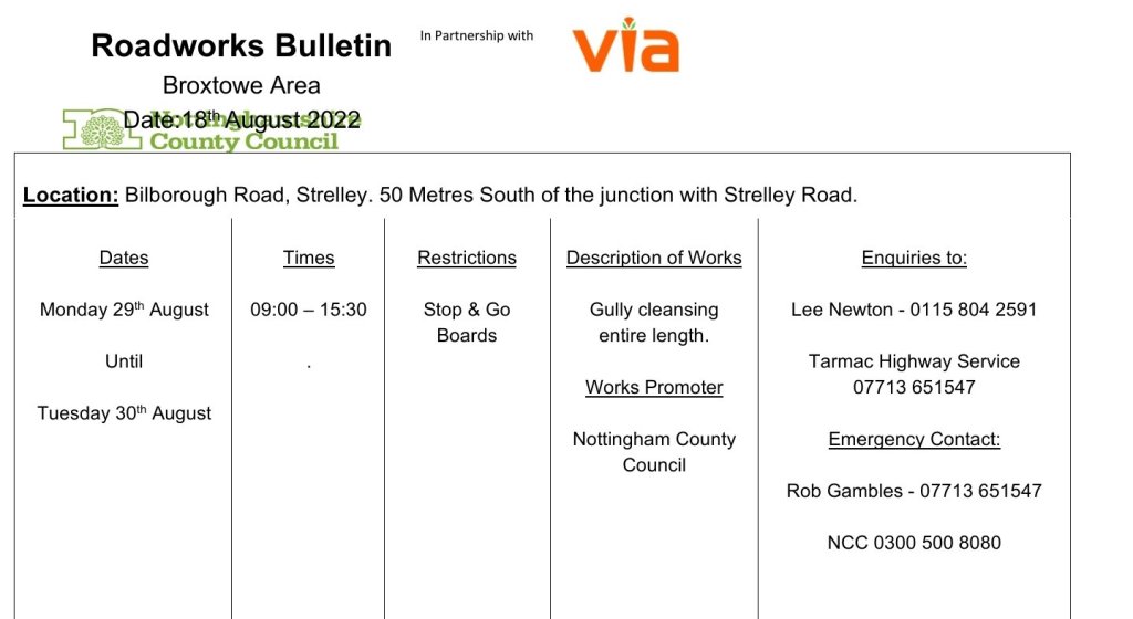 Please find attached the Roadworks Bulletin for Temporary Traffic Signals at Bilborough Road, Strelley. 50 Metres South of the junction with Strelley Road.