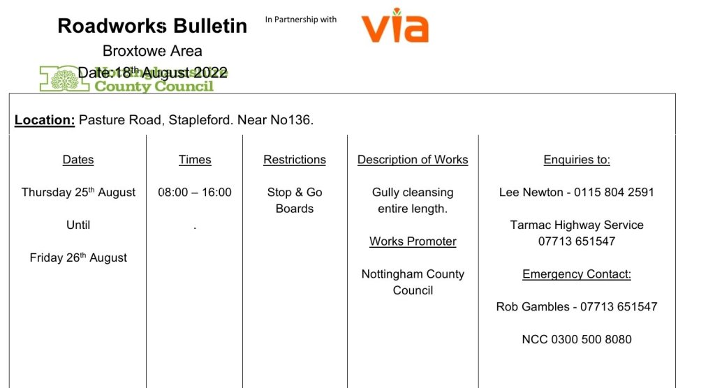 Roadworks Bulletin – Temporary Traffic Signals – Pasture Road, Stapleford – 25th August 18Aug 2022Add a comment Please find attached the Roadworks Bulletin for Temporary Traffic Signals at Pasture Road, Stapleford. Near No136. Share this:Tweet Click to share on WhatsApp (Opens in new window) WhatsApp Click to email a link to a friend (Opens in new window) Email Like Loading... Related
