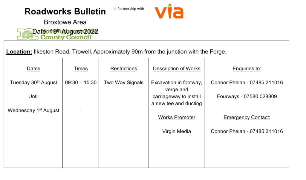 Please find attached the Roadworks Bulletin for Temporary Traffic Signals at Ilkeston Road, Trowell. Approximately 90m from the junction with the Forge.