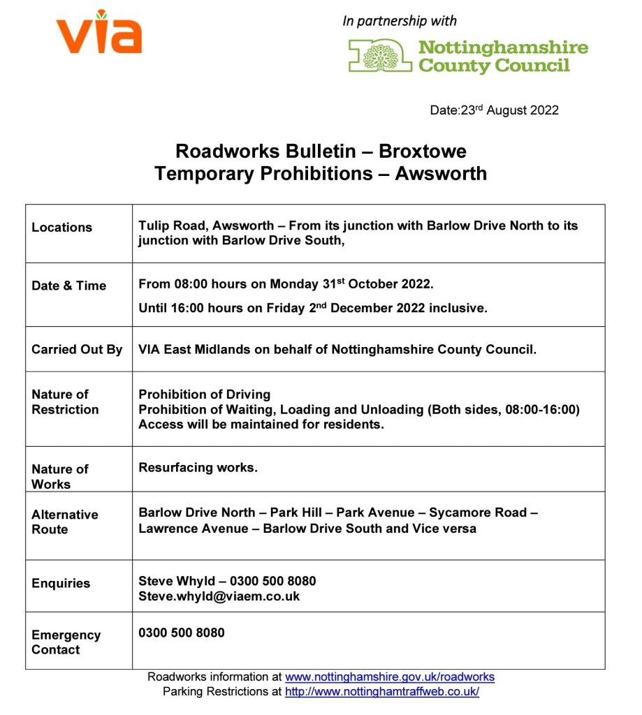 Roadworks Bulletin – Temporary Road Closure – Tulip Road, Awsworth 27Aug 2022Add a comment Please find attached the bulletin regarding forthcoming works at the above location. Share this:Tweet Click to share on WhatsApp (Opens in new window) WhatsApp Click to email a link to a friend (Opens in new window) Email Like Loading... Related