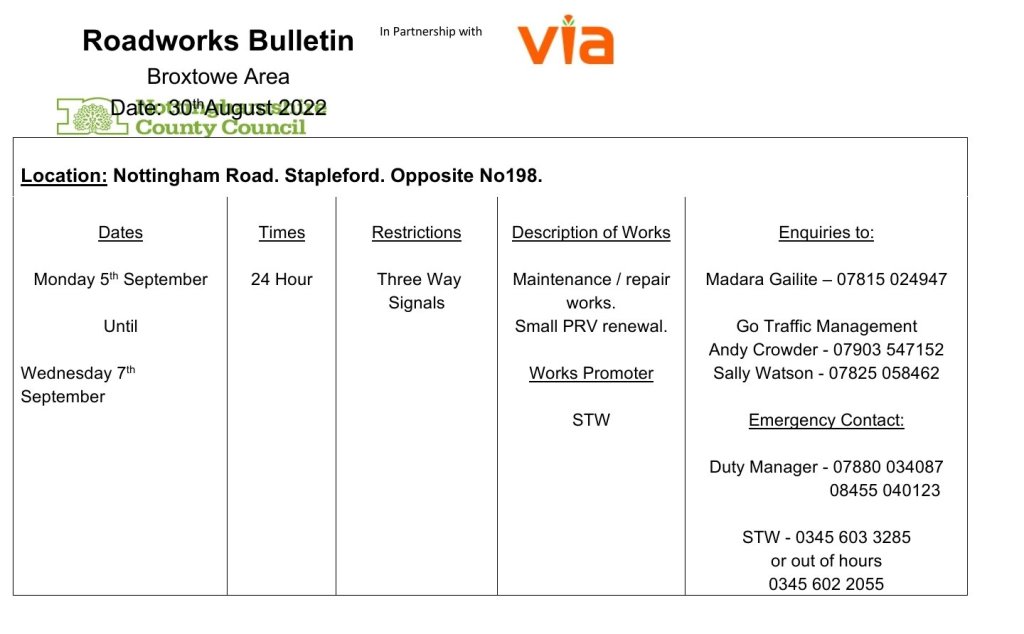 Roadworks Bulletin – Temporary Traffic Signals – Nottingham Road. Stapleford – 5th September 31Aug 2022Add a comment Please find attached the Roadworks Bulletin for Temporary Traffic Signals at Nottingham Road. Stapleford. Opposite No198. Share this:Tweet Click to share on WhatsApp (Opens in new window) WhatsApp Click to email a link to a friend (Opens in new window) Email Like Loading... Related
