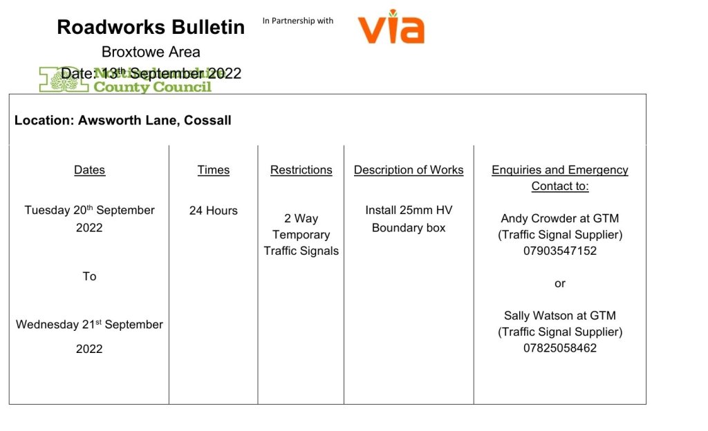 ROADWORKS BULLETIN – Temporary Traffic Signals – Awsworth Lane, Cossall 13Sep 2022Add a comment Please find attached the bulletin regarding forthcoming works at the above location. Share this:Tweet Click to share on WhatsApp (Opens in new window) WhatsApp Click to email a link to a friend (Opens in new window) Email Like Loading... Related