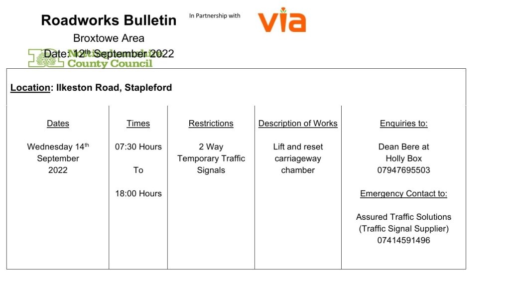 ROADWORKS BULLETIN – Temporary Traffic Signals – Ilkeston road, Stapleford 13Sep 202213 Sep 2022Add a comment Please find attached the bulletin regarding immediate works at the above location. Share this:Tweet Click to share on WhatsApp (Opens in new window) WhatsApp Click to email a link to a friend (Opens in new window) Email Like Loading... Related