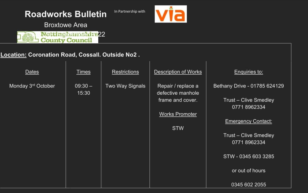 Roadworks Bulletin–Temporary Traffic Signals – Coronation Road, Cossall – 3rd October 29Sep 2022Add a comment Please find attached the Roadworks Bulletin for Coronation Road, Cossall. Outside No2 . Share this:Tweet Click to share on WhatsApp (Opens in new window) WhatsApp Click to email a link to a friend (Opens in new window) Email Like Loading... Related