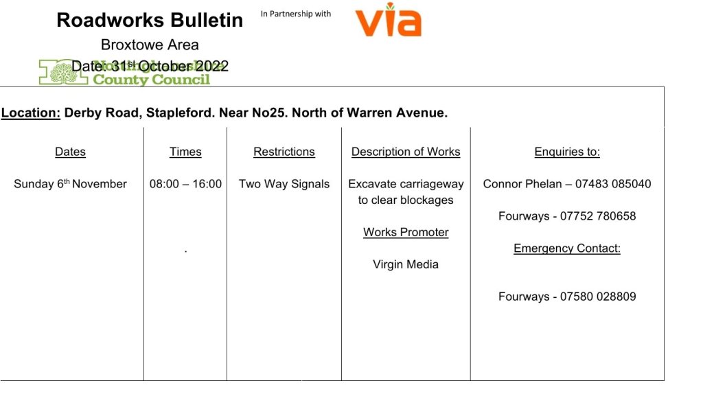 Roadworks Bulletin–Temporary Traffic Signals – Derby Road, Stapleford – 6th November 31Oct 2022Add a comment Please find attached the Roadworks Bulletin for Derby Road, Stapleford. Near No25. North of Warren Avenue. Share this:Tweet Click to share on WhatsApp (Opens in new window) WhatsApp Click to email a link to a friend (Opens in new window) Email Like Loading... Related