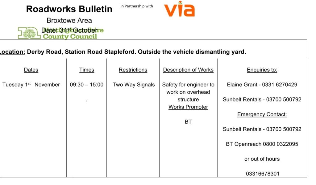 Roadworks Bulletin–Temporary Traffic Signals – Derby Road, Station Road, Stapleford – 1st of November 31Oct 2022Add a comment Please find attached the Roadworks Bulletin for Derby Road, Station Road, Stapleford. Outside the vehicle dismantling yard. Share this:Tweet Click to share on WhatsApp (Opens in new window) WhatsApp Click to email a link to a friend (Opens in new window) Email Like Loading... Related