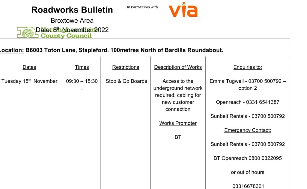 Roadworks Bulletin – Temporary Traffic Signals – B6003 Toton Lane, Stapleford. 8Nov 2022Add a comment Please find attached the Roadworks Bulletin for the B6003 Toton Lane, Stapleford. 100metres North of Bardills Roundabout. Share this:Tweet Click to share on WhatsApp (Opens in new window) WhatsApp Click to email a link to a friend (Opens in new window) Email Like Loading... Related