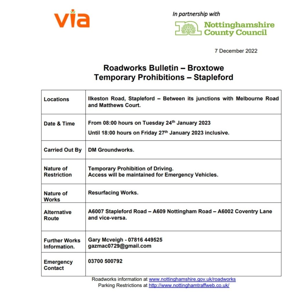 Roadworks – Ilkeston Road – January 24th -January 27th 2023 11Dec 2022Add a comment Roadworks – Ilkeston Road – January 24th -January 27th 2023 Share this:Tweet Click to share on WhatsApp (Opens in new window) WhatsApp Click to email a link to a friend (Opens in new window) Email Like Loading... Related