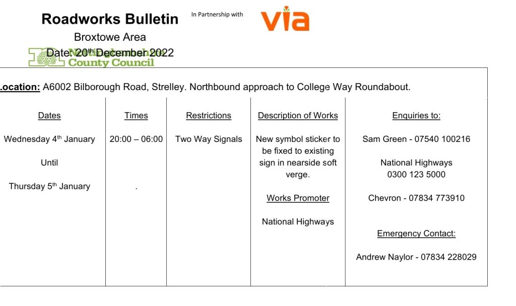 Please find attached the Roadworks Bulletin for A6002 Bilborough Road, Strelley. Northbound approach to College Way Roundabout.
