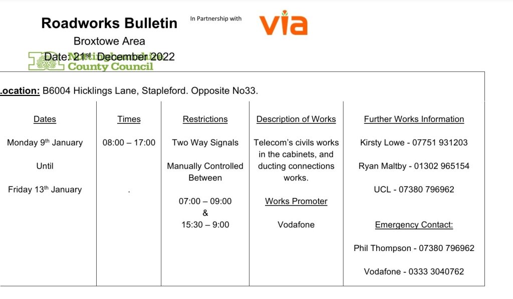 Roadworks Bulletin – Temporary Traffic Signals – B6004 Hicklings Lane, Stapleford – 9th January 21Dec 2022Add a comment Please find attached the Roadworks Bulletin for B6004 Hicklings Lane, Stapleford. Opposite No33. Share this:Tweet Click to share on WhatsApp (Opens in new window) WhatsApp Click to email a link to a friend (Opens in new window) Email Like Loading... Related