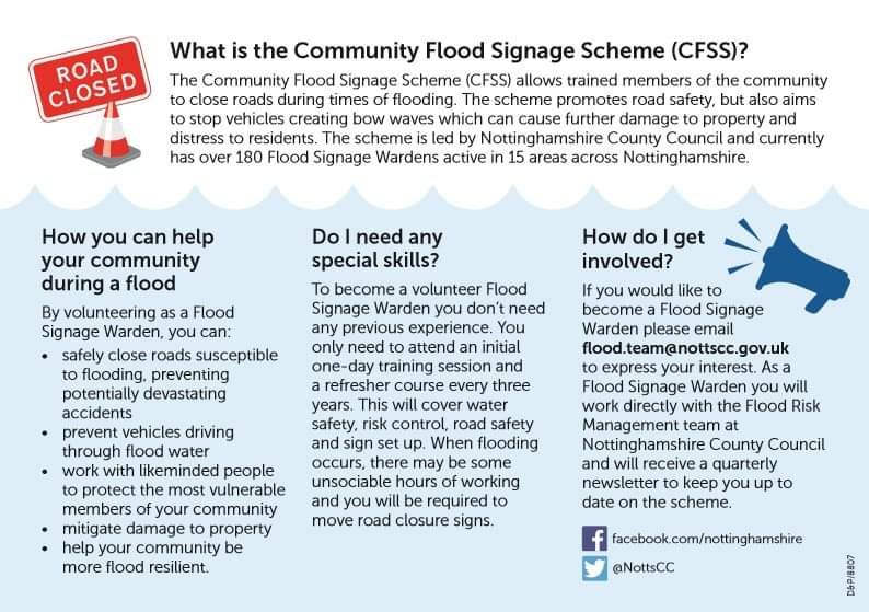 If you would like to become a Flood Signage Warden please email flood.team@nottscc.gov.uk to express your interest. As a Flood Signage Warden you will work directly with the Flood Risk Management team at Nottinghamshire County Council and will receive a quarterly newsletter to keep you up to date on the scheme.