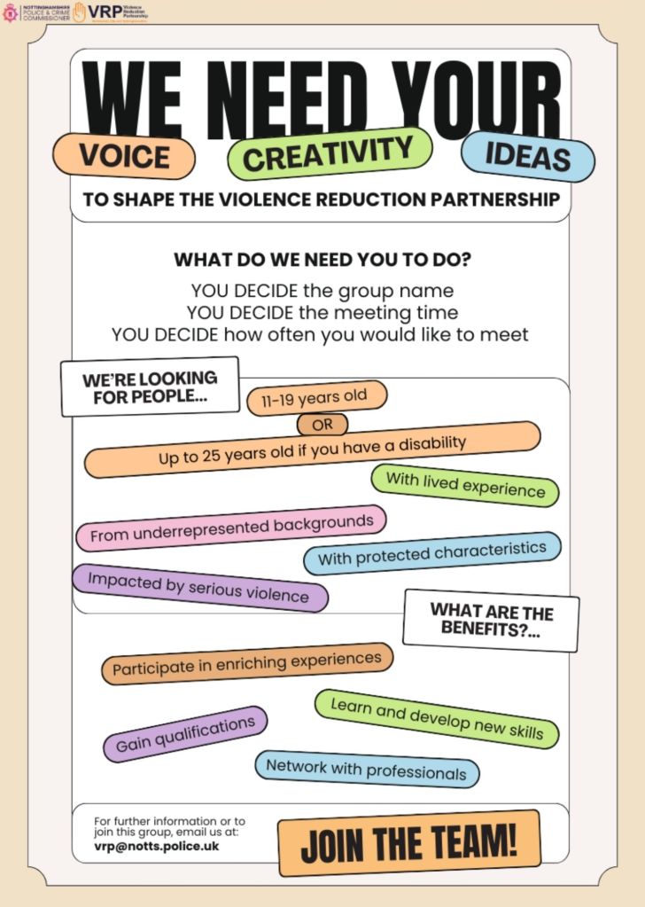 If you’re interested in joining or need more information, reach out to us at: vrp@notts.police.uk. Your involvement could make a significant impact on reducing violence and fostering a safer, more inclusive community.