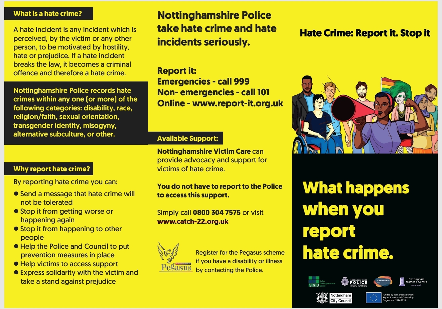 Nottinghamshire Victim Care offers advocacy and support for victims of hate crime. Importantly, you do not need to report the crime to the police to access this support. Simply call 0800 304 7575 or visit www.catch-22.org.uk.